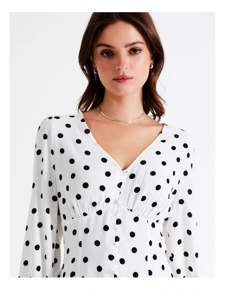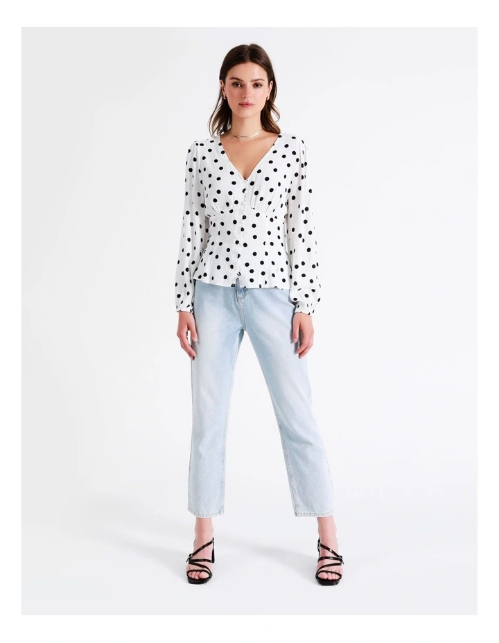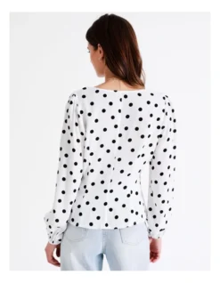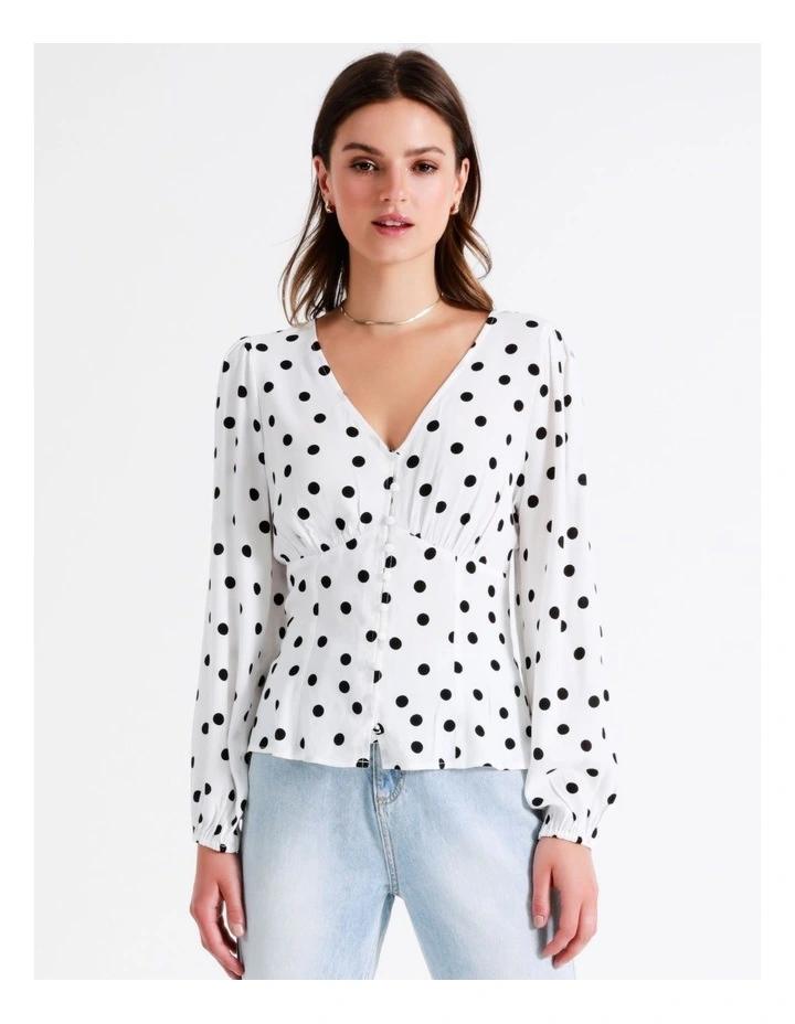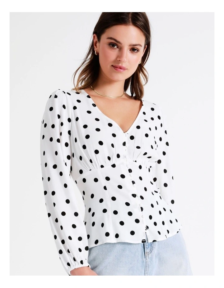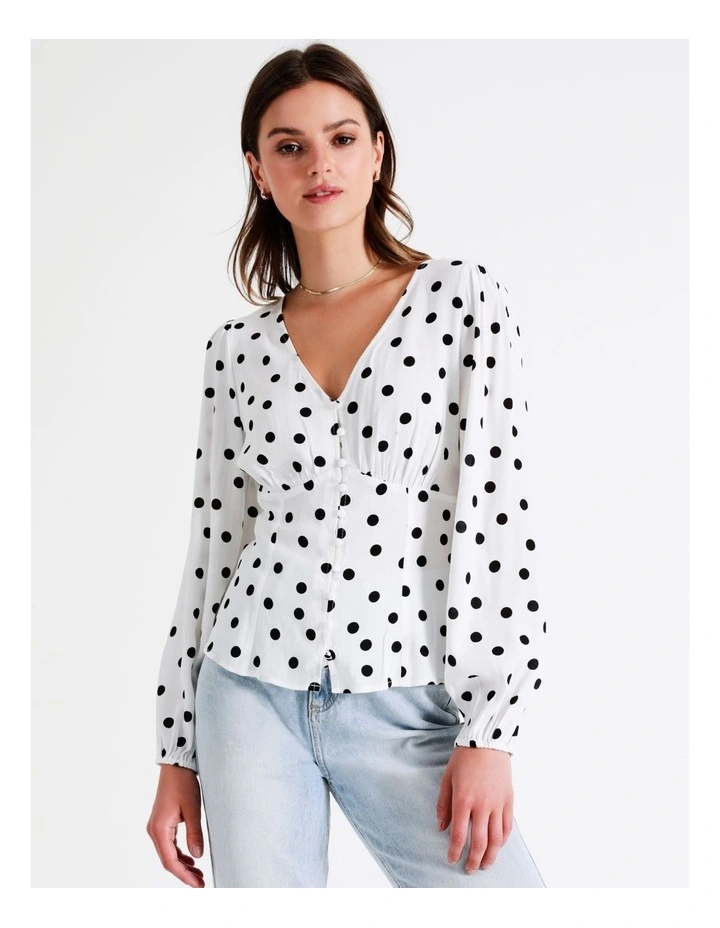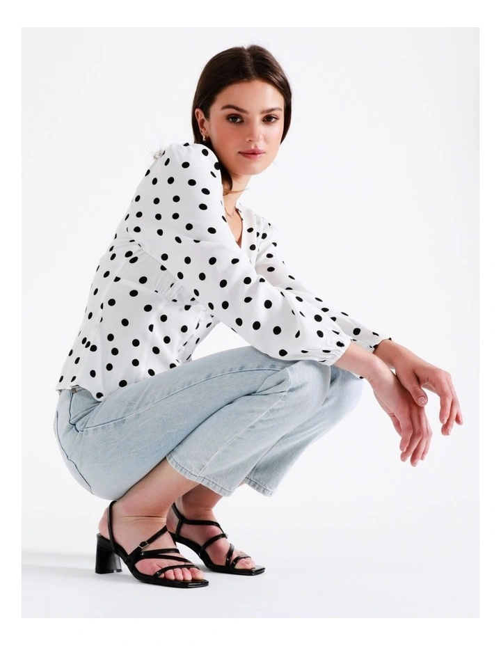 Style a chic outfit with a blouson sleeve top. This top has a lightweight feel and boasts an all-over spotted print and V-neckline. A versatile piece, you can wear it with all of your favourite outfits.