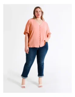 Style a chic look with a button through top. This top has a lightweight fit for comfortable wear, with frill sleeves and a button up front for easy wear. Pair with your favourite denim for an elevated casual look.