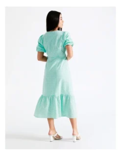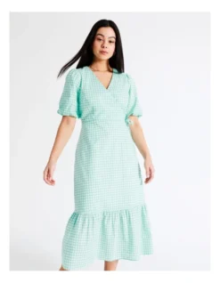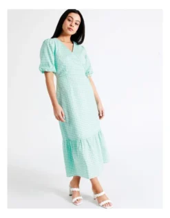 Beautiful and breathable, this midi dress is perfect for your next day out. Decorated with an all-over check print, a v-neckline, wrap design and a tiered skirt, this dress is ultra-flattering. Wear it with heels for an event-ready finish. Â