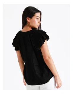 Style a chic look with a flutter sleeve top. This top has a lightweight feel for comfortable wear, with statement sleeves and a V-neckline. Pair with your favourite denim for an elevated casual look.