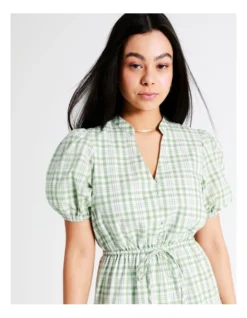 Tokito Puff Sleeve Check Recycled Cotton Blend Mini Dress in Sage