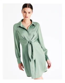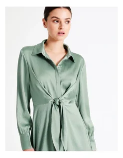 Tokito Recycled Tie Front Satin Mini Shirt Dress in Sage