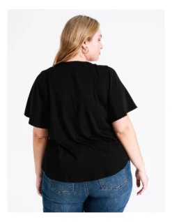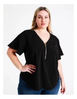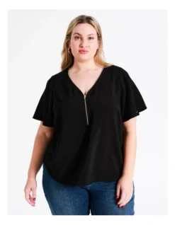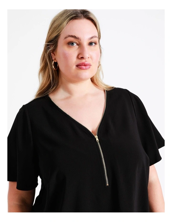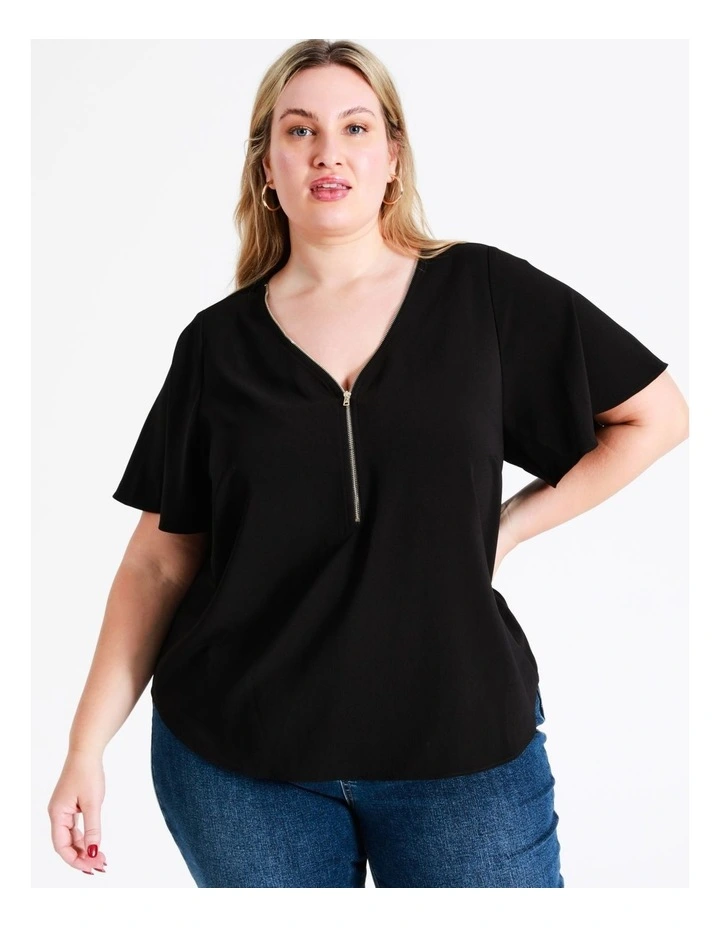 Tokito CurveĀ Recycled Zip Front Flutter Sleeve Top in Black