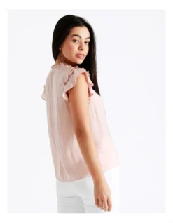 Elevate your style with a fashion-forward tank. This tank has a satin-look finish, with a V-neckline and ruffle detailing at the sleeves. Wear it from day to night.