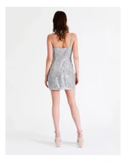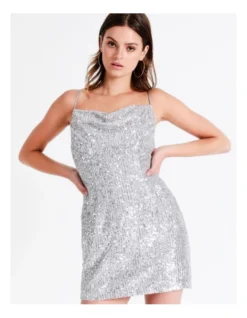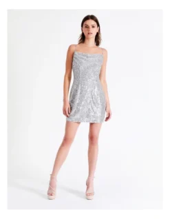 Tokito Sequin Cowl Neck Mini Dress in Silver